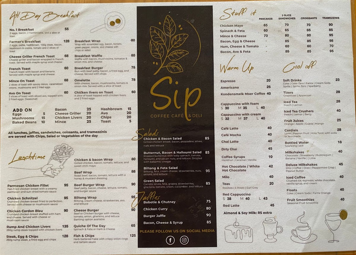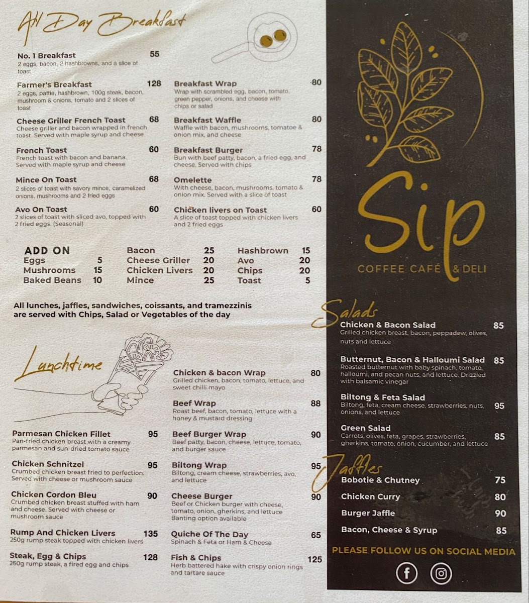 The cozy, welcoming vibe of Country Cafe (Old Sip) Menu offers a perfect blend of comfort food and South African flavors. Nestled on Chief Mgiyeni Khumalo Dr, White River, this charming spot serves up an array of mouthwatering dishes that will have you coming back for more. Whether you're in the mood for a hearty breakfast to start your day, a light snack in the afternoon, or a filling dinner to wrap things up, this menu has something for everyone. With options that cater to all tastes, from savory to sweet, each meal is prepared with fresh, local ingredients, ensuring that every bite is a treat. Don’t miss the chance to experience the warmth and flavor of this local favorite, where the food truly speaks for itself.